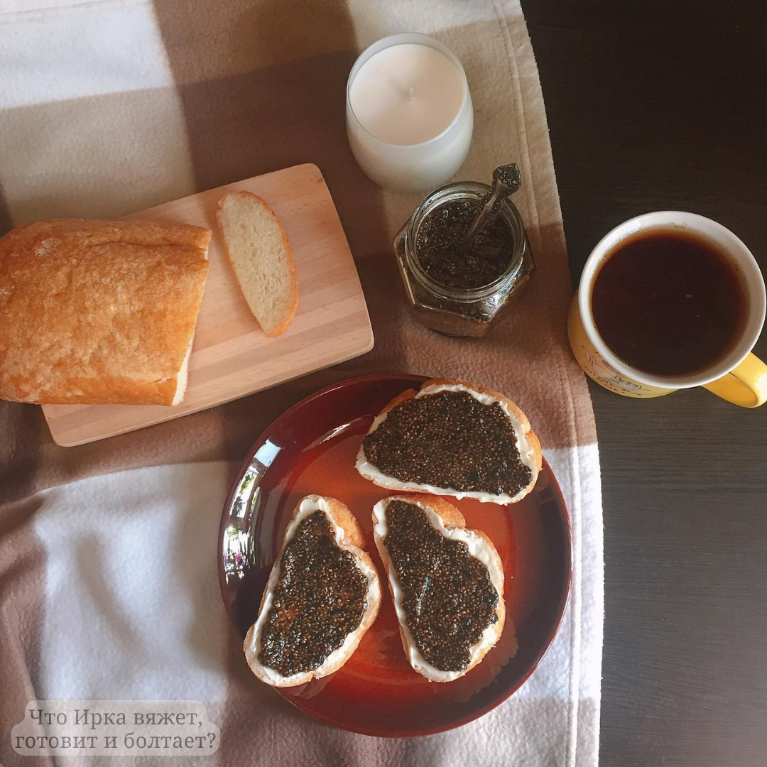 Знаю, что сейчас идёт Пост, так что рецепт будет многим актуален (сама я его не соблюдаю, поэтому на фотографиях могут быть не постные продукты, в данном случае - сливочное масло, которое я использовала с этой "икрой"). Заменить сливочное масло можно спредом - это растительный аналог, либо есть ряд рецептов по изготовлению "сливочного" масла. Вам бы было интересно про них узнать? Мои 6 пометок по рецептам на странице. Чтобы отбросить некоторые вопросы. Первый рецепт который решила тут разместить - один из любимых завтраков. А любимый он еще и потому, что он не сладкий, как многие, а солёный. Рецепт: Нам понадобится: Сразу скажу, что я не пробовала с льняным маслом, у меня оливковое, по этому не могу сказать, как будет на вкус, но писали, что рыбный вкус с ним насыщеннее. Процесс: По этому рецепту вы можете для себя рассчитать нужное количество продукта, но помните, что чиа хорошо разбухает, не стоит добавлять слишком много чиа в банку, иначе масса получится слишком крутой. Еще вы может