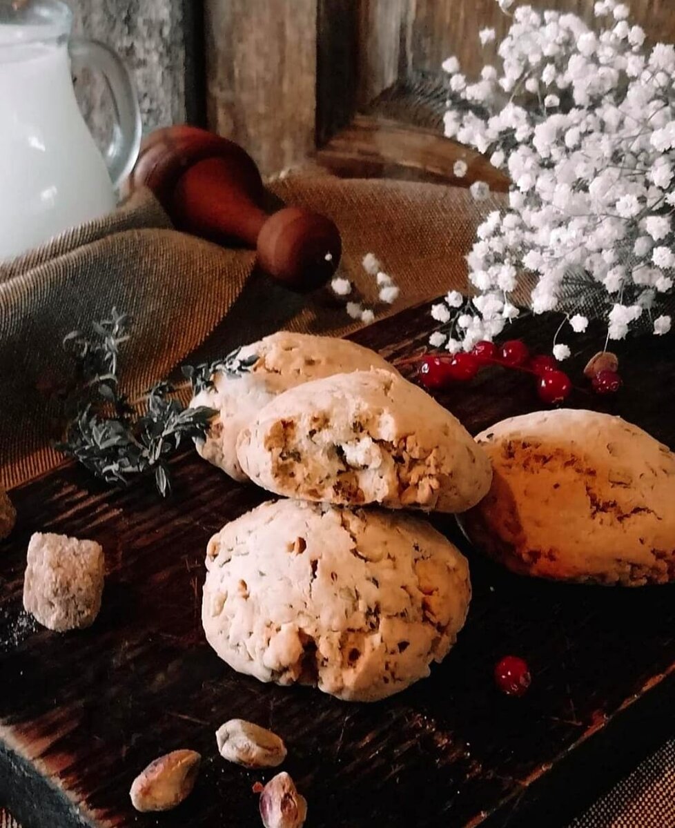 Мука 150 Сахар 50 Фисташки 100 Яйцо 1 Масло сливочное 59 Соль Разрыхлитель или сода 0.5 с.л Орехи измельчить, но не сильно мелко, перемешать с мукой и разрыхлителеммю Яйцо взбить с сахаром и мягким сливочным маслом Добавить сухие ингредиенты, все перемешать. Дать тесту постоять в холодильнике 1 час Отвесить по 40 гр, скатать шарики и немного приплюснуть Выпекать 170-180 15-20 минут до уверенного золотого цвета