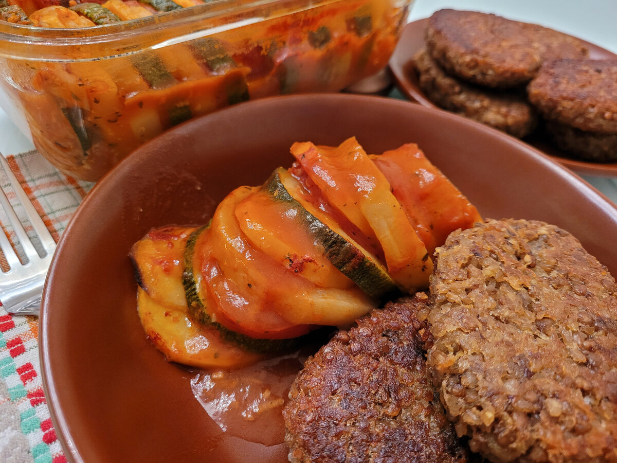 Рататуй - это всегда вкусно и очень сочно. Как большой любитель овощей, я очень люблю это блюдо, особенно оно придется к месту в сезон овощей, а так же в пост. Все ингредиенты беру как говорится "на глаз":) Все нарезаю колечками и плотно друг к другу укладываю в форму для запекания, чередуя овощи между собой. К томатной пасте добавляю немного воды (нужно чтобы томатная заливка почти покрывала овощи), добавляю немного растительного масла, пропущенный через пресс чеснок и любимую приправу "Томаты и чеснок". Все как следует смешиваю и заливаю овощи. Плотно накрываю форму фольгой и отправляю в разогретую до 180 градусов духовку до готовности (у меня на приготовление ушло около часа). Приятного аппетита! Друзья, спасибо за просмотры, жду ваши комментарии, делитесь своим мнением и подписывайтесь на мой Канал, чтобы не пропустить новые интересные рецепты. Отдельное спасибо за подписку и репост :)