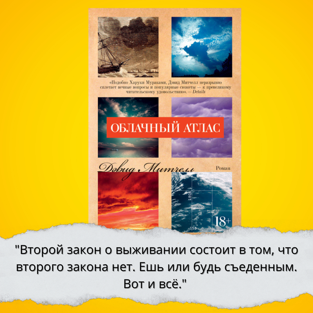 2004 г. — Букеровская премия Скажу честно - я очень долго читала эту книгу и дело тут не только в объеме - 700+ страниц, но в сложности восприятия текста. Сам Митчелл так сказал о своей книге: "Буквально все главные герои, за исключением одного, являются реинкарнацией одной и той же души в различных телах на протяжении всего романа, идентифицируемых по родимому пятну… это просто символ действительной универсальности человеческой природы. Само название „Облачный атлас“; облако относится к постоянно меняющимся проявлениям атласа, который является неизменной человеческой природой, которая всегда остается и всегда будет оставаться таковой. Так что темой книги