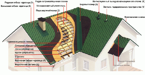 Для домов коттеджного типа, как правило, применяют чердачные или скатные крыши. Они состоят из верхней части (оболочки), называемой кровлей, основания (обрешетки или сплошного настила), которое непосредственно поддерживает кровлю, и несущей конструкции - стропил, которые обычно опираются на наружные и внутренние стены.