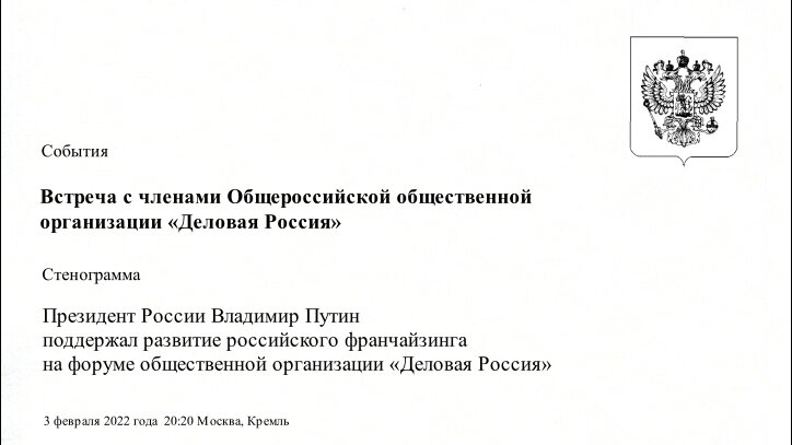 Президент России Владимир Путин поддержал развитие российского франчайзинга на форуме общественной организации «Деловая Россия» 3 февраля 2022 года.