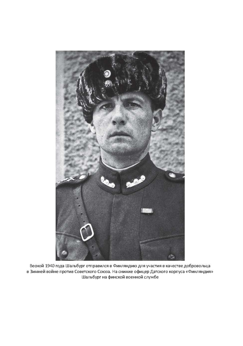 К. Ф. Шальбург, уроженец России, полурусский, полудатчанин, офицер трех армий. Он водил знакомство и дружбу с монархами — Николаем II, Романовыми и королевской семьей Дании. Он пожимал руку злодеям — Адольфу Гитлеру и Генриху Гиммлеру, и в итоге сам служил злу. Еще при жизни Шальбург стал знаковой и символической фигурой для датских добровольцев и национал-социалистов. Но с его смертью воспевание «героя» достигло небывалых прежде высот, и торжественная церемония стала лишь первым шагом на пути создания культа почитания Шальбурга. В национал-социалистической прессе, как датской, так и немецкой, было напечатано бесчисленное количество панегирических статей, посвященных его памяти. И везде о жизни и военных делах Шалбурга рассказывалось с явно выраженной пропагандистской целью. Так, в посвященную памяти Шальбурга программу Датского радио был включен следующий рассказ военного корреспондента СС Флемминга Хельвег-Ларсена: «Однажды Шальбург с небольшим отрядом своих эсэсовцев был на передово