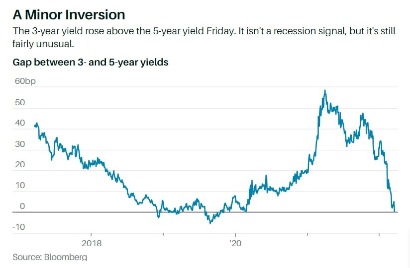 Barron’s обращает внимание на поведение кривых доходностей гособлигаций США с разной дюрацией. Доходность по 3-летним облигациям только что превысила доходность по 5-летним облигациям впервые с 2020 г., всего через два дня после повышения ставки ФРС. Это считается инверсией кривой доходности, хотя и небольшой. По мнению экспертов издания, это не сигнал рецессии, но все же довольно необычно. Ни 3-х, ни 5-летняя кривая доходности не являются индикатором рецессии для ученых и наблюдателей за рынком. Разрыв между доходностью 2- и 10-летних облигаций значительно сократился (это более тревожный сигнал). Доходность 2-летних облигаций теперь всего на 20 базисных пунктов выше доходности 10-летних облигаций по сравнению с 77 базисными пунктами в начале года. Доходность 3-месячных облигаций пока значительно ниже доходности 10-летних облигаций с существенным разрывом в 1,7 процентных пункта. Признаюсь, что пока не имею однозначного объяснения столь тревожных трендов. Доходности более краткосрочн
