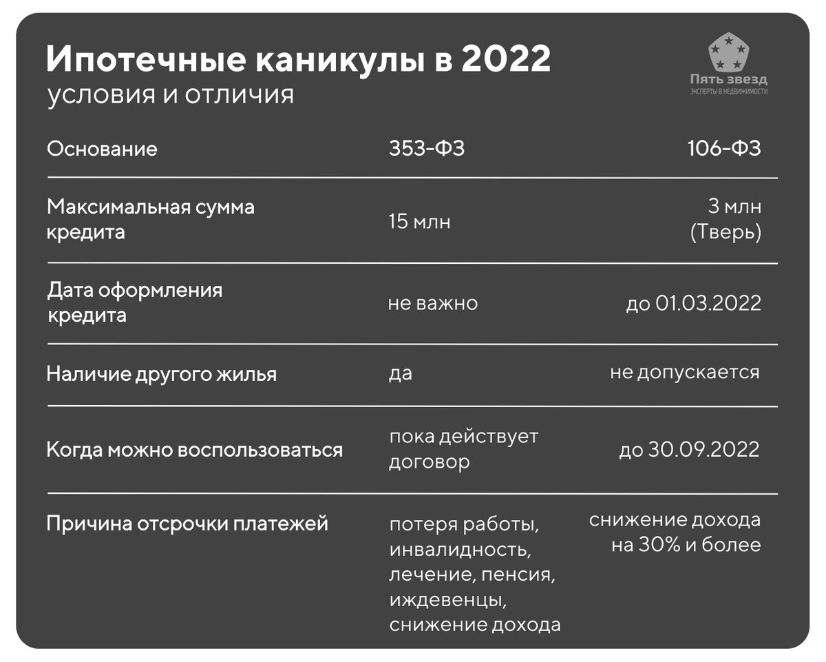 Ипотечные каникулы — это льготный период, в течение которого можно освободиться от платежей по ипотеке. Воспользоваться «каникулами» можно в рамках двух законов: 106-ФЗ и 353-ФЗ по одному разу (то есть всего дважды). Что общего у этих каникул: 🤝🏻 Сохраните себе на память и поделитесь с другими. Хотя желаем, чтобы вам не пригодилось и все было хорошо. Подписывайтесь на Telegram-канал «Пять звезд»