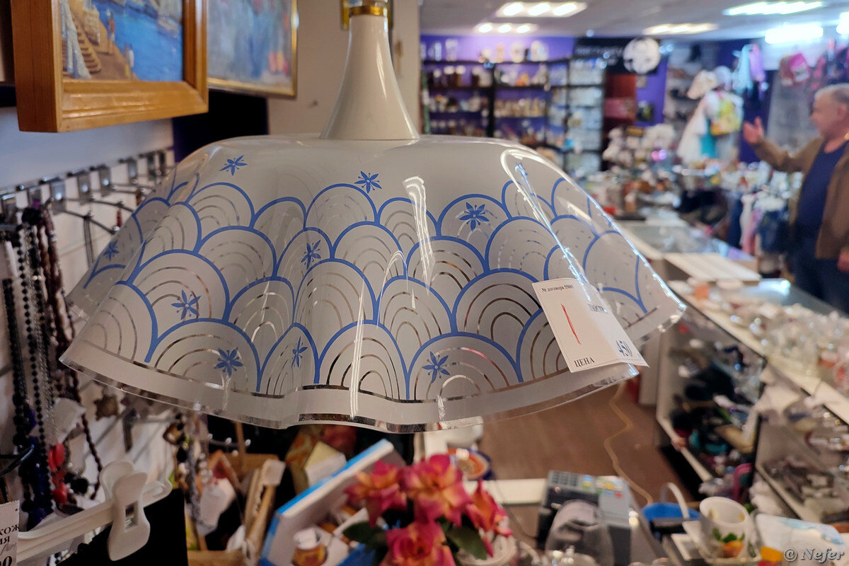 Удивительное дело, сколько раз проходила мимо, и не знала, что в этом подвале есть такое. Вчера спустилась по лестнице и обалдела: советские чашки, блюдца, тарелки, кружки, стаканы, стопки, статуэтки, вазочки. Много бус и всяких украшений, даже люстра висит. Прямо "филиал Ретроблохи" на Кристалле. Цены на многое сопоставимы. Чашка с блюдцем стоит в среднем 100-150 рублей. Стакан вон вижу 90 рублей. Есть симпатичные чайные наборы и сервизы, состояние приличное, без сколов и потемнений. Насколько я понимаю, это комиссионный магазин. Все, что годами хранилось в сервантах, теперь ожидает любителей ретро и коллекционеров. Чашка с блюдцем Германия. На донышке клеймо "Кольдиц фарфор из ГДР", фабрика с историей. Немецкая посуда была популярна в СССР, особенно легендарная "Мадонна", если вы понимаете, о чем я. Стаканы "8 марта" - будто открытка к празднику. Есть ценители, которые обрадуются такому презенту. Стоимость набора всего 180 рублей. Люстра с заглавной фотографии продается за 450 рублей