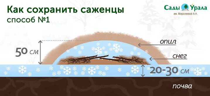 Многие садоводы предпочитают заказывать саженцы в специализированных питомниках. В таких хозяйствах и ассортимент шире, качество гарантированно, цена приятней. Но как сохранить саженец, если посылка пришла раньше срока посадки? Питомник «Сады Урала» больше 35 лет занимается интродукцией и акклиматизацией посадочного материала. С момента основания здесь отправляют саженцы по всей территории страны и знают, как помочь садоводам сохранить будущий сад до посадки. Способ №1 (Когда лежит снег) В самых северных районах России снежный покров может сохраняться и до середины апреля. Такие погодные условия позволяют соорудить так называемый «холодильник из снега». Выберите в саду небольшой участок в зависимости от высоты и количества саженцев, уберите верхний слой снега, оставив до земли 20-30 см. На расчищенную поверхность насыпьте опил и выложите саженцы. Разложить саженцы нужно свободно, чтобы они не соприкасались друг с другом. Обильно засыпьте корни опилом, слоем в 10 см, чтобы он не таял. С