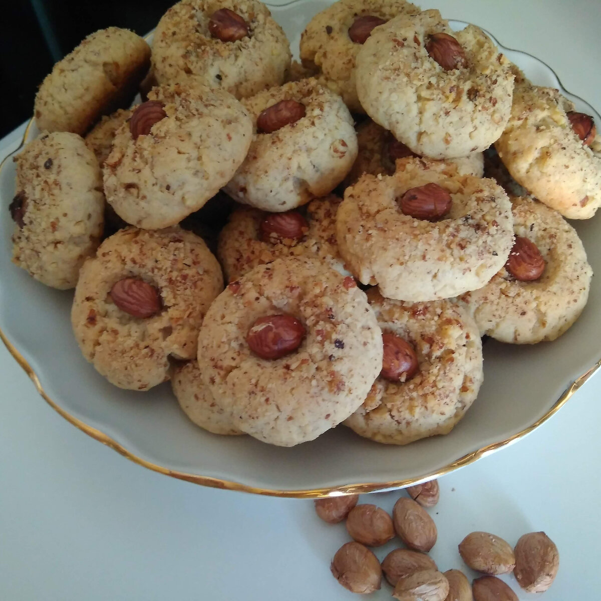 На 28 -30 шт. понадобится: - фундук (лесной орех) молотый 140 гр. + целые ядра 30 шт. - масло сливочное 110 гр. - мука 220 гр. - яйцо 1 шт. крупное - сахар 100 гр. - соль 1/4 ч ложки - разрыхлитель 1 ч.ложка - ванильный сахар 1 пакетик - кардамон молотый 1/2 ч. ложки Готовим: Откладываем 30 целых ядрышек фундука, остальное измельчаем в крошку при помощи блендера. В просеянную муку высыпаем сахар, соль, разрыхлитель, ванильный сахар, и кардамон (у меня в этот раз к сожалению его не оказалось 😕). Масло режем кусочками и перетираем с мучной смесью. Вбиваем яйцо, всыпаем 110 гр. молотых орехов (ещё 30 гр. понадобится позже). Замешиваем тесто и убираем в пакет на 30 минут. Пока готовим противень - застилаем его пергаментом для выпечки. Включаем духовку на 180 градусов. Отщипываем от теста примерно равные кусочки теста и скатываем шарики размером с грецкий орех. Каждый шарик одной стороной обкатываем в ореховой крошке и выкладываем на противень на небольшом расстоянии. (Я обычно р