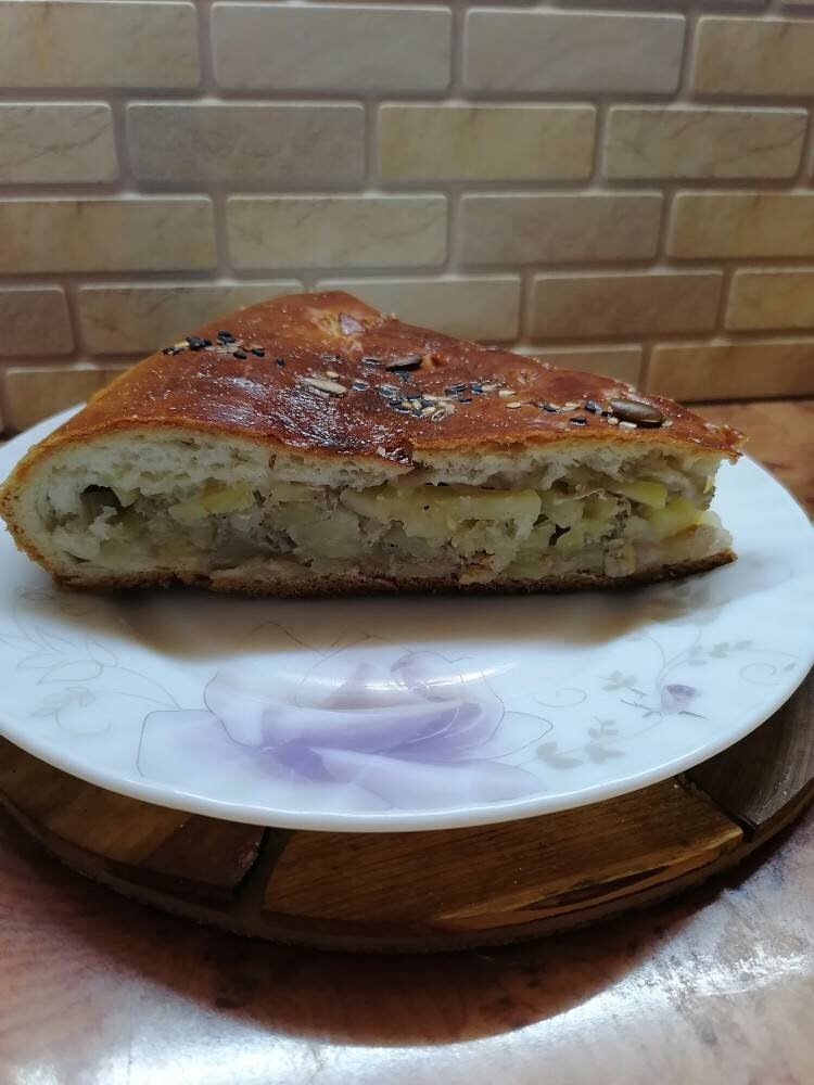 Очень сытная вкуснятина🥰готовит всегда такой пирог моя Мамуся.Только тесто я делала по рецепту @cook_15570217 #пирогидомашние #кчаю #пирогсфаршем #пирогсмясом #выпечка Ингредиенты: Тесто дрожжевое:, ст/л муки, ст /л сахара, ч /л соли, ст /л сухих дрожжей или 1 пакетик(у меня Саф Момент), ст растит.масла, ст тёплой воды, ст муки, Начинка:, Картофель, Луковица, чеснока, Фарш свинной(у меня домашний), Соль, Перец чёрный молотый, ст/л растит.масла, Обмазать верх:, Яйцо, Смесь семян Способ приготовления: Тесто:смешать всё кроме 8 ст муки и дать дрожжам разойтись минут 15. Затем добавить муку и замесить тесто.Нскрыть пакетом и в тёплое место подходить. Тем временем готовим начинку: Картофель нарезаем тонкой соломкой.Мелко режем лук и чеснок. Смешать,посолить, поперчить и добавить пару столовых ложек растит.масла. Смазать протвень.Слегка раскатать тесто толщиной 3-5 мм и подтянуть до размеров противня.Выкладываем начинку. Накрыть вторым листом.Залепить края и спрятать их к стеночке противня.