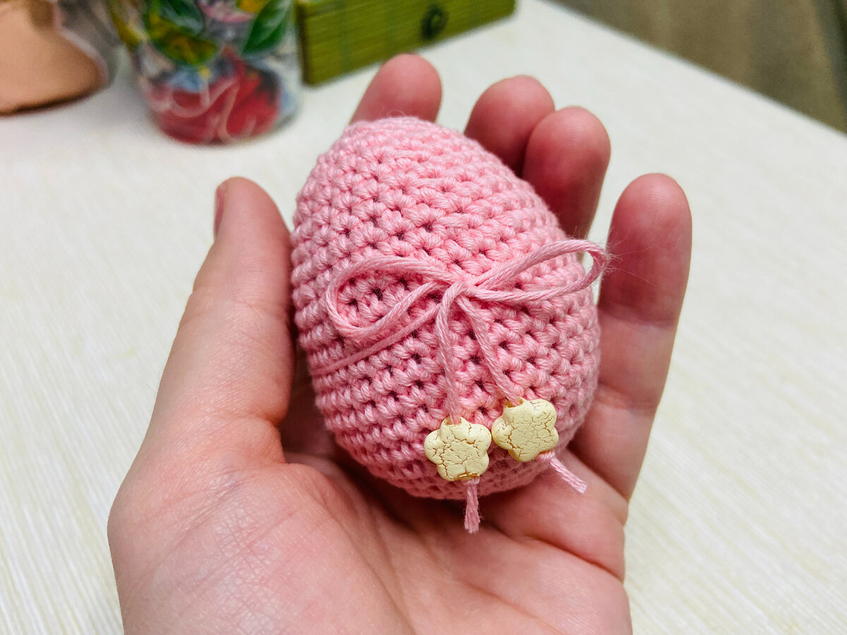 В 2022 года православную Пасху отмечают 24 апреля. В этом году я решила вспомнить все то, что я вязала обычно к Пасхе. Пока сын был маленький я под каждый праздник старалась вязать крючком что-то безопасное для игры ему. На Новый год это были елочные игрушки из фетра или вязаные игрушки, а к Пасхе я вязала яйца. Для друзей и знакомых вязала я и разные пасхальные сувениры. В этом мастер-классе я свяжу крючком розовое яйцо, которое пригодится мне потом для создания мастер-классов по вязаным пасхальным сувенирам. Видео обзор по вязанию крючком яйца к пасхе. Материалы и инструменты: Больше информации по подбору пряжи и крючка можно найти в статье: В ходе вязания крючком яйца будут использоваться сокращения условных обозначений: вп - воздушная петля; сс - соединительный столбик; сбн - столбик без накида. Ход процесса вязания крючком яйца для Пасхи. Шаг 1. Наберите на крючке 4 вп, 1 сс в в последнюю от крючка петлю для формирования кольца. Шаг 2. Наберите для подъема 1 вп, 7 сбн в коль