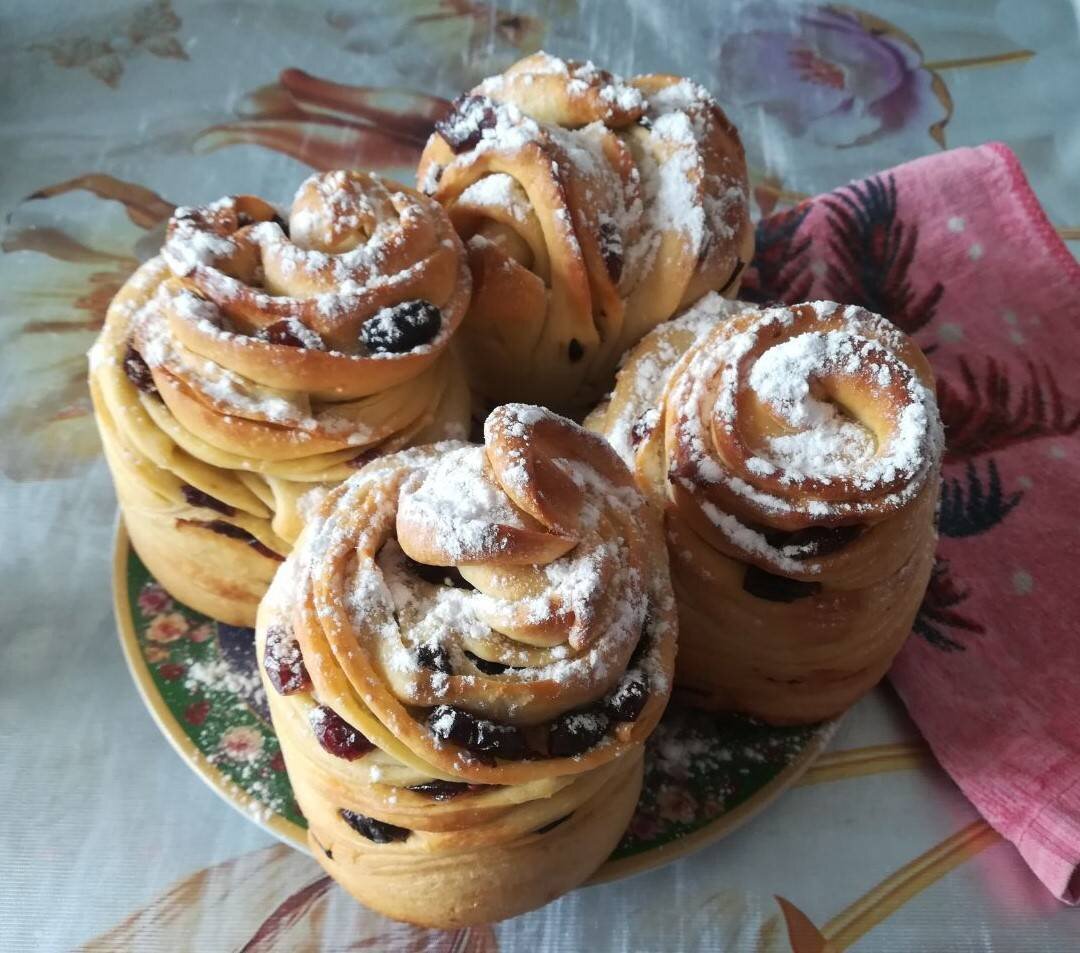 Ингредиенты: теплого молока, сахара, сухих дрожжей, яйцо + 2 яичных желтка, ванильного сахара, соли, растопленного сливочного масла, муки, Для начинки:, мягкого сливочного масла, вяленой клюквы, сахарная пудра для посыпки