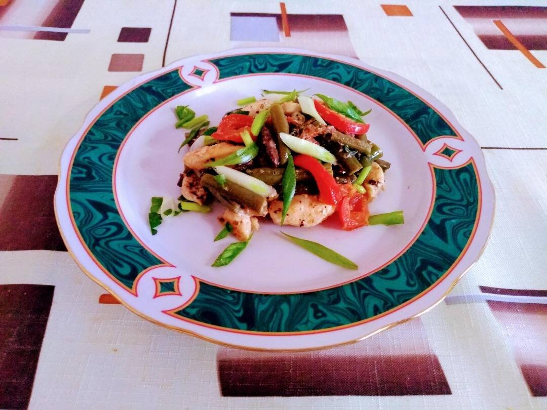 Ингредиенты: Грудка куриная (у меня 185 грамм), Зеленой фасоли, Сметана, Шампиньоны, Помидор, Перец болгарский, Соль, свежемолотый перец по вкусу, Итальянские травы, Зелень лук зеленый
