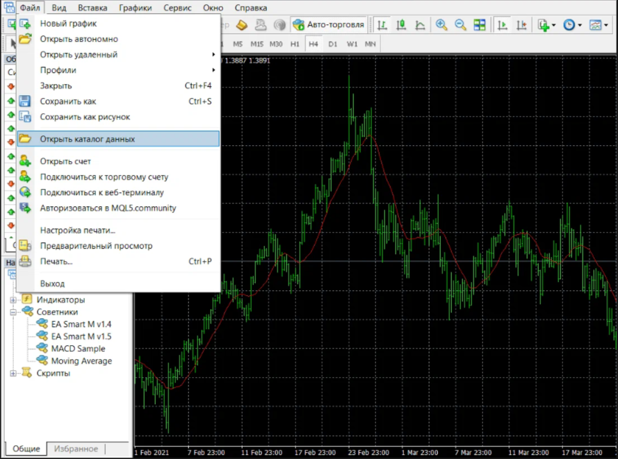 1. Прежде всего нам необходимо открыть реальный(учбеный счет) по этой ссылке, скачать и установить терминал Metatrader 4. 2. Впервые скачав архив с экспертом, пользователь ищет файл .ехе , как для установки обычных программ. Обычно не находит. Иногда продавцы систем предоставляют такой файл, но все что он делает — распределяет файлы по папкам. Мы вполне можем сделать это самостоятельно. Итак, смотрим какие файлы у нас есть в наличии. Обычно это файл самого советника (.ех4 или .mql — для торговли подойдет и тот и тот) и какие-то вспомогательные файлы (индикаторы или библиотеки). 3. Файл советника (.ex4 или .mql) нужно поместить в папку MQL4/experts в каталоге данных вашего терминала. Чтобы попасть в каталог данных, в терминале нажимаем Файл -> Открыть каталог данных Откроется папка в ней мы заходим в раздел MQL4 в каталог Experts И туда копируем файлы наших советников Закрываем папку, перезапускаем МТ4. 4. Находим окошечко с названием Навигатор Если у вас нет такого окошечка нажмите на