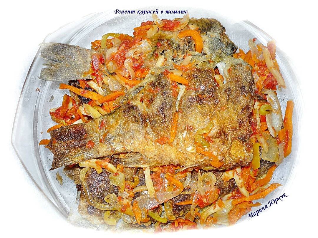 #пост Хочу предложить вам рецепт простого и очень вкусного блюда - карасей в томате. Во время тушения рыба пропитывается соусом, в котором готовится, и в результате получается очень вкусной, нежной, косточки становятся более мягкими. Если нет карасей, то это блюдо можно приготовить и из других речных или морских рыб. Ингредиенты: - караси, - лук репчатый, - морковь (крупная), - перец болгарский, - пастернак, - томатная паста, - сахар, - соль, - перец чёрный молотый, - перец душистый, масло растительное, мука для панировки Способ приготовления: Мясо карася сочное и нежное. У нас 7 прекрасных карасей. Овощи чистим. Морковь натираем на крупной тёрке (можно нарезать тонкой соломкой), пастернак и перец болгарский нарезаем соломкой, лук нарезаем полукольцами, отправляем их обжариваться на разогретую сковороду с растительным маслом, периодически помешивая. Когда овощи будут готовы, добавляем томатную пасту, соль, сахар, перец черный молотый и лавровый лист. Тушим овощи на слабом огне минут 5-