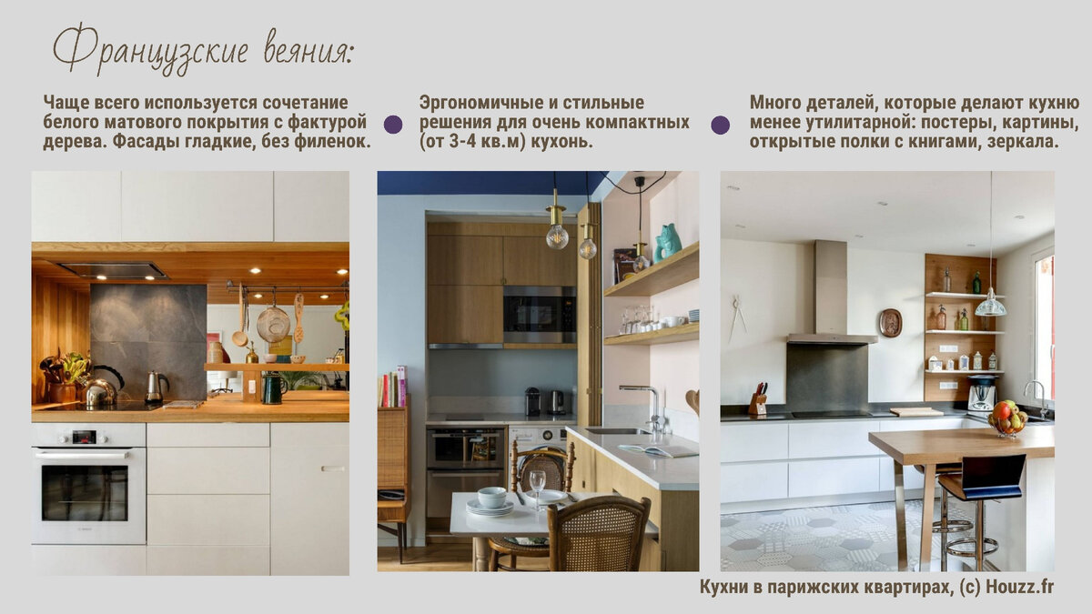 Слово дизайнеру «Кухонного завода»: Французы готовят вкусно и с удовольствием. Однако обычно они держат у себя достаточно мало утвари и посуды для сервировки — но она будет обязательно стильная. Поэтому они будут из одних бокалов пить вино в обычный пятничный вечер и на Рождество. Пример французов ценен тем, как можно организовать всю “кухонную историю” красиво, даже если вы живете в скромной по площади квартире. Это актуально и для России: ведь если есть квартира 40-50 квадратных метров в исторической части Петербурга, не каждый захочет ради увеличения площади терять всю атмосферу города и переезжать в новостройку». Пример: три проекта, вдохновленных французскими кухнями.