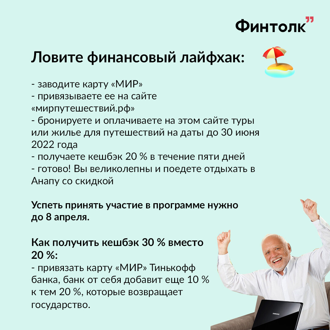 Некогда объяснять, друзья, мы нашли финансовый лайфхак, на который у вас есть 36 часов. Вы, наверное, знаете, что есть такой проект — мирпутешествий.рф. Это госпрограмма, позволяющая получать кешбэк за бронирование отелей. И вот сейчас можно вернуть до 20% кешбэка, если забронировать номера или апартаменты до 8 апреля. В том смысле, что на бронирование осталось два дня. А даты можно выбирать любые вплоть до 30 июня 2022 года. Ньюансы: - Кешбэк обещают вернуть в течение пяти дней после оплаты. - Бронировать нужно номера на срок от двух дней. - Оплачивать нужно с карты «Мир». Да, фишка акции в том, что на сайте мирпутешествий.рф нужно привязать свою карту системы «Мир» и провести оплату именно с нее. Максимальная сумма кешбэка за одну оплату — 20 000 рублей. Но броней, как и оплат, может быть несколько. Получается, что если вы бронируете номера в гостинице на сумму 10 000 рублей, вам вернут 2 000 рублей. Но мы знаем, как вернуть не две, а три тысячи. Можно увеличить кешбэк до 30 %, если