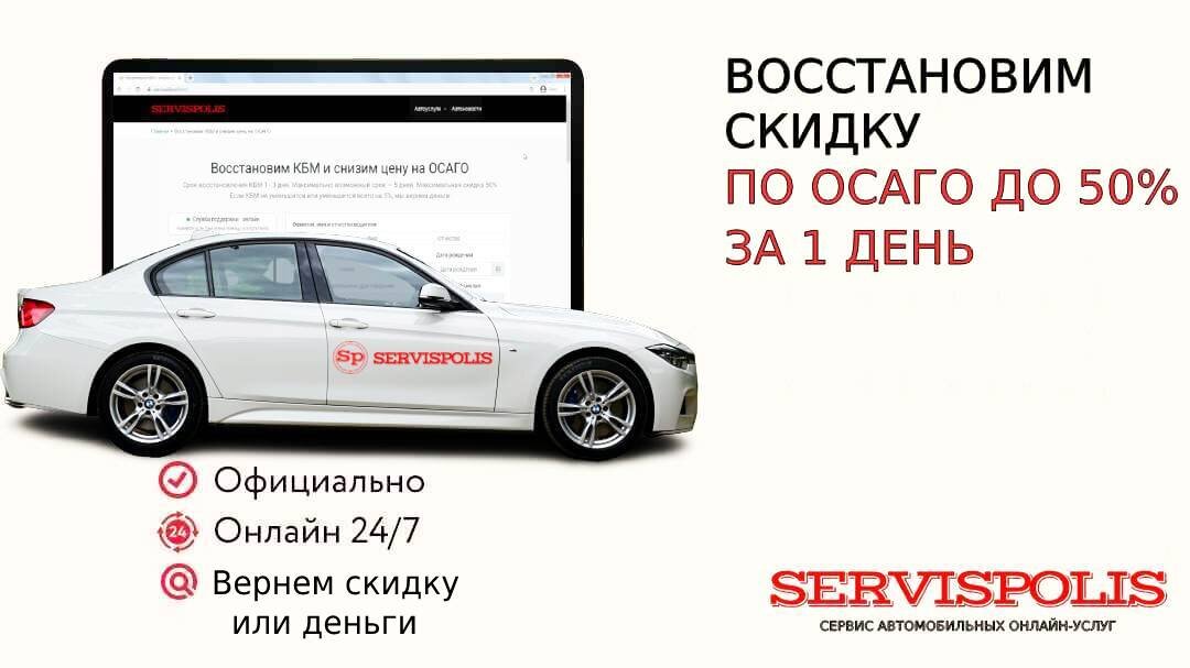 На стоимость полиса ОСАГО основательно влияет коэффициент Бонус-Малус – КБМ. Величина КБМ формируется исходя из стажа вождения, времени непрерывного страхования и количества аварий, совершенных по вине автовладельца. При безаварийной езде и непрерывном страховании, КБМ с каждым годом уменьшается, и стоимость полиса ОСАГО ежегодно снижается на 5%. Максимальная скидка – 50%. Информация о КБМ автовладельца хранится в базе РСА – Российский союз автостраховщиков. Скидка на ОСАГО распространяется при страховании в любых страховых компаниях. Довольно часто случается, что по ряду причин КБМ некорректно отображается в базе данных и стоимость страхового полиса ОСАГО существенно возрастает. Агрегатор автомобильных онлайн услуг – SERVISPOLIS.RU позволяет быстро восстановить положенную скидку на ОСАГО. Проверить коэффициент КБМ на сайте можно бесплатно, а восстановление скидки недорогое. Кроме того, если КБМ не снизится или снизится всего на 5%, гарантируется возврат денежных средств. Так ч