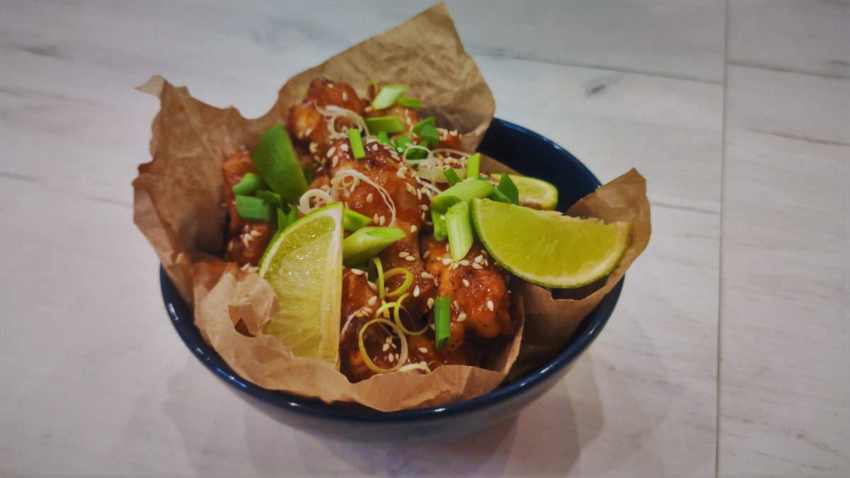 9. Лайм - 1 шт. Приготовление: Куриные крылья делим на фаланги, солим, перчим, добавляем растительное масло 2-3 ст. ложки, перемешиваем и отправляем на противне в заранее разогретый до 180 С духовой шкаф, на 20-30 минут (до готовности). Пока крылья запекаются, приготовим наш острый соус. Для этого чистим и натераем на мелкой тёрке имбирь (после того как имбирь натерли, его нужно отжать, что бы удалить лишнюю влагу) и чеснок. На разогретой сковороде растапливаем сливочное масло и обжариваем на нем имбирь и чеснок
