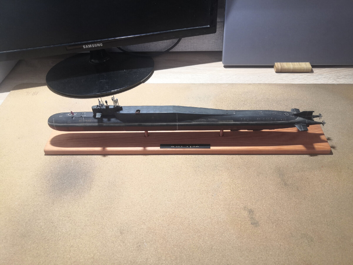 Приветствую, дорогие друзья! Вот и подошла к концу работа над БДРМ проекта 667 К-114 "Тула" от нашей любимой фирм Звезда в масштабе 1/350. Я уже писал, что это моя первая работа на морскую тематику, до этого у меня не было ни какого опыта по сборке моделей флота. Изначально мне собранную тушку привез зять на покраску и досборку, но я естественно не мог ограничится только этим. Лодка оказалась отличной кошкой для получения нового опыта и реализации идеи с имитацией резинового, шумо-вибро защитного покрытия корпуса субмарины. Вот собственно результат моих трудов... Штатная подставка от Звезды, ушла в помойку, т.к. она была совсем смешной и несуразной. Новую подставку изготовил из дверного наличника и двух медных втулок, покрыл морилкой цвета "орех" Лодка вышла достаточно большой, общая длинна 48см. Будет отличным дополнением в интерьере рабочего кабинета. По просьбе зятя не стал увлекаться эффектами и состариванием (износом) лодки. Посли смывки и покрытия матовым лаком, нанес легкий