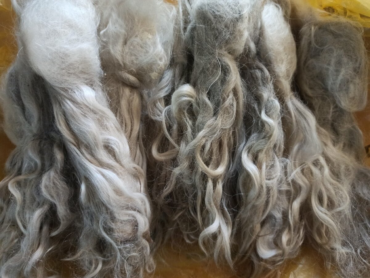 Чтобы волосы у куклы выглядели натурально, лучше всего использовать козий пух ( шерсть козы без подшерстка). Вот такие локоны я покупаю. Они ещё не мытые и не вычесаны. Можно так же купить шкурку пуховой козы. Прежде чем сделать волосы кукле необходимо помыть эти локоны и хорошо вычесать весь осетевой волос, он короче пуха и жёсткий. После этого можно красить локоны или сделать парик, а потом покрасить его. После того, как парик окрашен ( или сделан сразу из окрашенных волос), его можно приклеить на голову куклы. Парик сделанный таким образом можно расчëсывать и делать различные прически кукле.