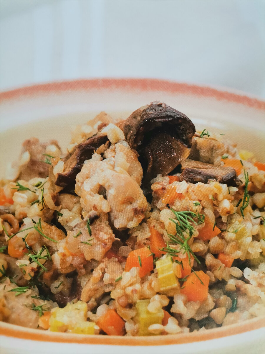 Ингредиенты: Способ приготовления: 1. Нарезать свинину крупными кубиками 2. Нарезать морковь мелкими кубиками 3. Налить 2-3 ст.л. растительного масла в чашу, положить свинину.Выбрать режим "Жарка", продукт-"Мясо". Установить время приготовления 10 мин. Обжарить, перемешивая, 5 смн.-мясо должно приобрести золотую корочку. 4. Добавить морковь через 5 минут 5. Добавить после окончания приготовления измельчённые сухие грибы, предварительно замоченные в холодной воде и отжатые. 6. В мультиварку выложить промытую гречневую крупу. Посолить, поперчить, добавить орегано и базилик. 7. Выбрать режим "Тушения" или "Каша". Налить в емкость 1 стакан воды и готовить 30 мин. При подаче посыпать рубленой зеленью.