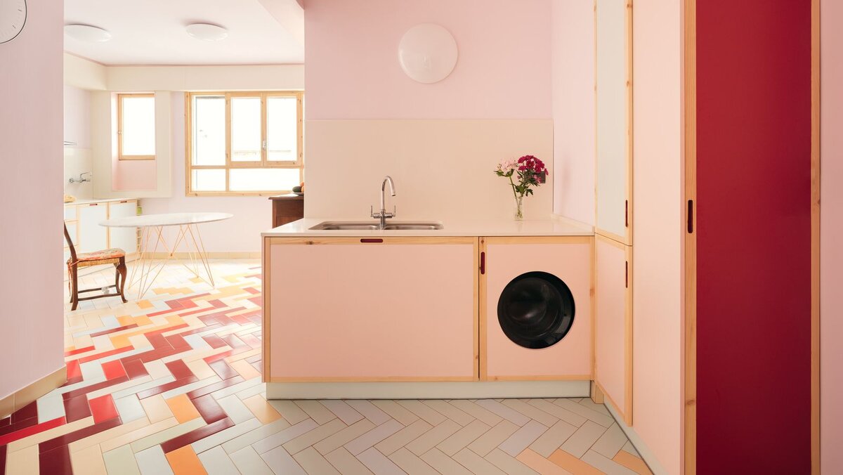 Студия Azab подарила новую жизнь квартире в Бильбао, наполнив пространство яркими акцентами и деталями в стиле ретро Перекрасить все в розовый — первое, что пришло в голову дизайнерам студии Azab, когда они увидели эту некогда серую полуразрушенную квартиру, расположенную в доме 1968 года в Бильбао. Все плюсы интерьера — обилие естественного света, добротная деревянная мебель в темных оттенках и отделка в тон — свела на нет неудобная планировка, поэтому сначала команда занялась организацией пространства. В первую очередь дизайнеры убрали ненужные перегородки, увеличив площадь комнат. Затем они выкрасили все стены в единый нежно-розовый оттенок, который придает интерьеру свежести и помогает создать жизнерадостную атмосферу. Пол в кухне оформлен керамической плиткой, выложенной «елочкой». Красочная мозаика из красных, желтых и зеленых фрагментов задала тон всей квартире. Главный повторяющийся элемент дизайна — тонкие деревянные рамки на фасадах шкафов. Они уравновешивают пространство и с
