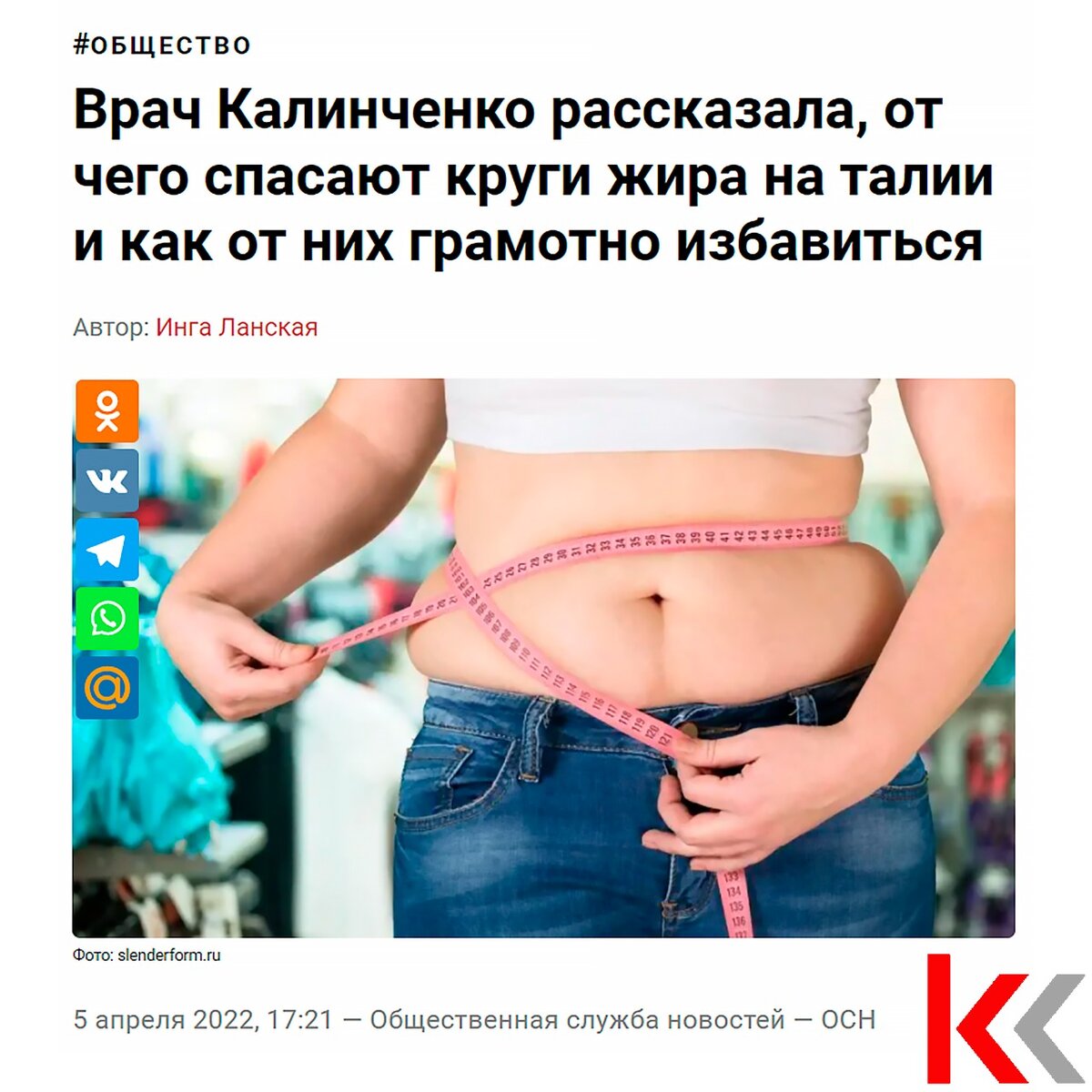 Круги жира на талии говорят о попытке организма выравнять дисбаланс. Именно поэтому коррекция этого недостатка с помощью липосакции приводят к ухудшению здоровья. Для чего нужны «бублики» жира на талии и как побороть ситуацию, Общественной службе новостей рассказала заведующая кафедрой эндокринологии и холистической медицины ФНМО МИ РУДН, д.м.н., профессор Светлана Калинченко. «До 45 лет у здоровых женщин не должно быть проблем с внешним видом. Жировые “бублики”, которые начинают расти вокруг талии, это признак дефицита эстрогена. Гормоны отвечают за обмен веществ в организме, и если нам чего-то не хватает, это сразу сказывается на внешности. Сначала морщинки – если они появляются до 45 лет, то надо искать причину их возникновения. Но вместо этого девушки идут к косметологам: ботокс, мезотерапия. Закололи лицо, но дефицит остался. Затем начинают выпадать волосы, а это все тот же дефицит эстрогенов. Затем начинается ожирение», – описала проблему врач. Иногда жир на талии образует нескол