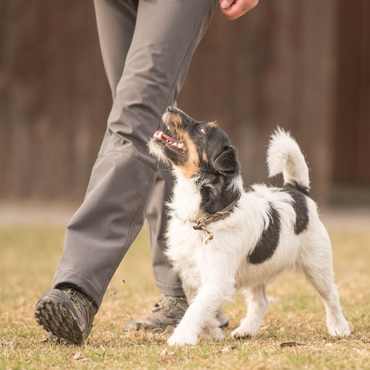 Приём отрабатывается в следующем порядке. После выгуливание собаки дрессировщик принимает основную стойку с собакой. Для этого он берет собаку на короткий поводок и ставят её с левой стороны от себя так, чтобы колено его левой ноги касалось правой лопатки собаки. Такое положение собаки около дрессировщика наиболее удобно для управления собакой и передвижения с ней. Левой рукой дрессировщика перевод поводок 20-30 см от ошейника так, чтобы он свободно двигался в слегка сжатой кисти руки. На правую руку выше кисти надевают петлю поводка и остальную часть поводка собирают гармошка в кулак (поводок, находящийся между правой и левой руками, должен немного провисать, чтобы не мешать движением руки дрессировка при ходьбе). Добившись правильного положения собаки у ноги, дрессировщика поощряет её поглаживание, восклицанием (хорошо) лакомством. Затем он называет кличку собаки, чтобы привлечь её внимание, после небольшой паузы подаёт команду (рядом), делает рывок поводком вперёд и одновременно н