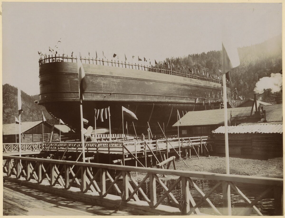 Альбом спуска парома-ледокола "Байкал" 17 июня 1899 г. Село Лиственичное. 6 фотографии? разного размера, на паспарту. На обороте верхней крышки папки автограф от руки чернилами: "Дар инженера Е.С. Серебренитского. V. 1912" pdf в конце поста Альбом спуска паромо-ледокола.pdf #иркутск #байкал #история иркутска #ледокол