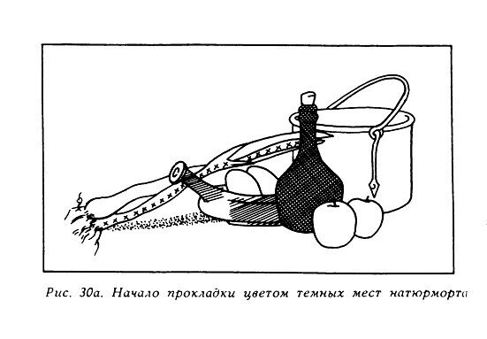 Рис. Зба. Начало прокладки цветом темных мест натюрморта