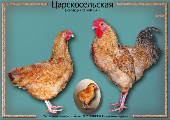 Пока эту группу мясо-яичного направления еще сложно назвать породой, но ею уже заинтересовались те птицеводы, которым продуктивность важнее, чем чистопородность. Царскосельскую курицу выводят на базе трех пород: Полтавской глиняной, Бройлер 6 и Нью-Гемпширов. Благодаря получившемуся очень красивому оперению кур этой породной группы нередко относят еще и к декоративным, хотя их продуктивные показатели не уступают уже устоявшимся породам кур универсального направления. Средний вес царскосельской несушки – 2,4 кг. Петух в среднем весит 3 килограмма. Представители царскосельской породной группы быстро набирают вес, и это радует заводчиков, разводящих птицу на мясо. Куры среднеспелые, несутся с 5 месяцев. Годовая продуктивность несушки – 180 яиц, в среднем весящих 60 г. Скорлупа яиц от царскосельских кур может варьироваться от светло- до темно-коричневй окраски. К безусловным достоинствам этой породной группы нужно отнести тот факт, что несмотря на относительно высокую яйценоскость, куры