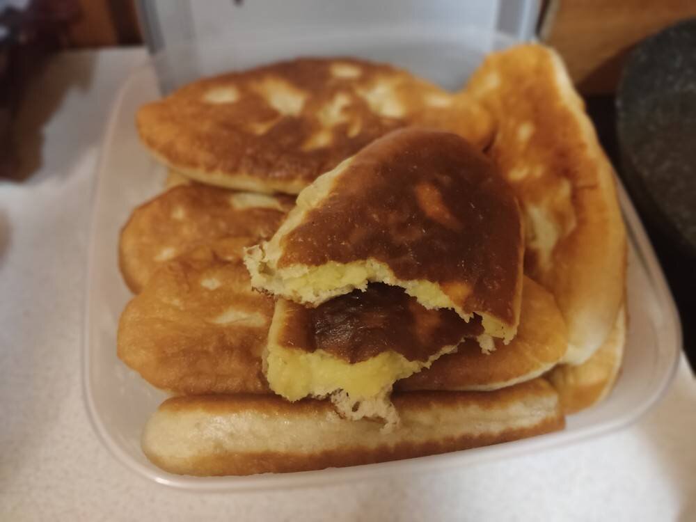 Після підходу тіста, відщипувати невеликі шматочки та за допомогою качалки, чи можна руками, розкачати в круг товщиною ~5-7мм. Викласти начинку з картоплі,добре защіпити та смажити на розігрітій олії до золотистого кольору з 2 сторін.