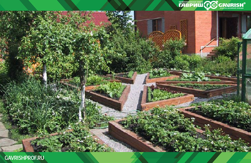 Бортики из досок или брусьев советую покрасить в коричневый, черный или темно-бордовый цвет. Форма грядок диктует формальный геометрический принцип планировки.
