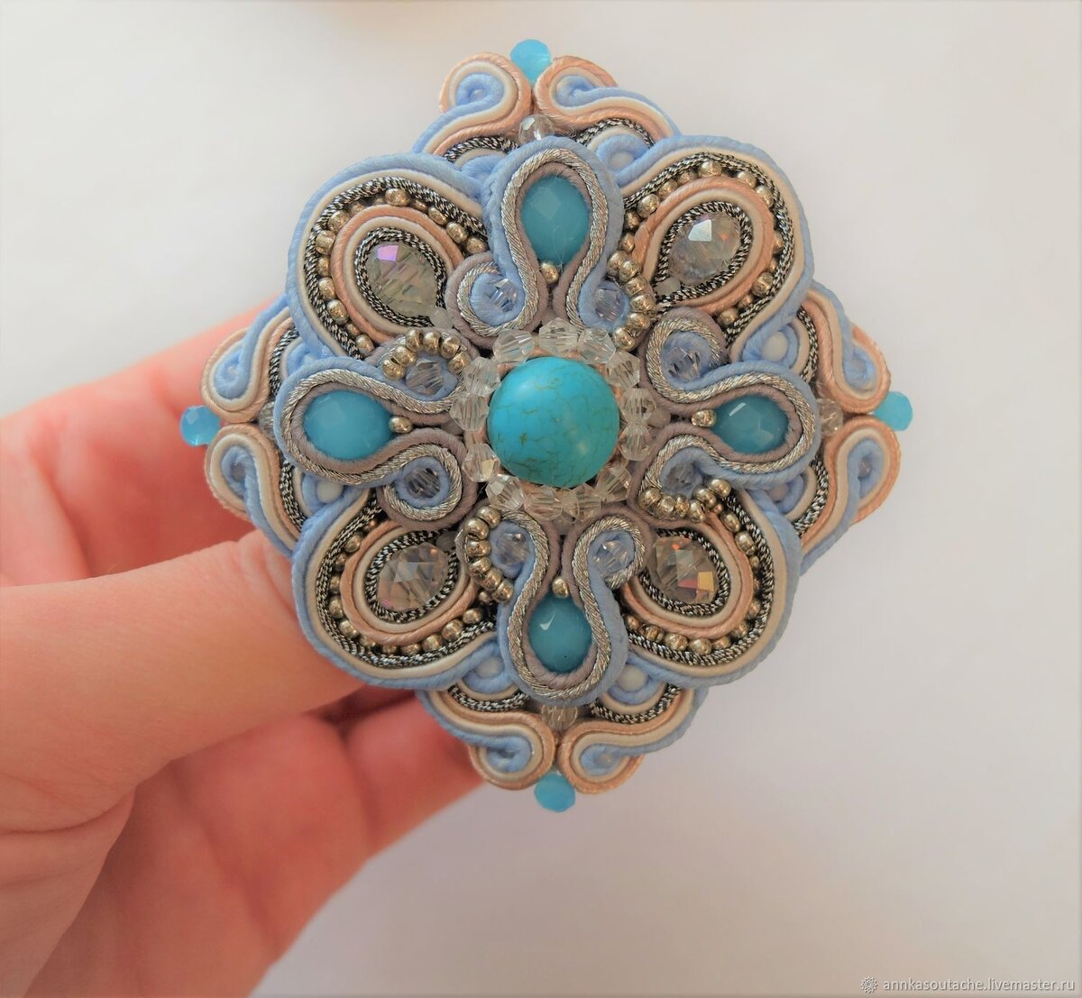 Брошь Снежинка в сутажной технике с бирюзой и хрусталем станет вашим любимым украшением. Идеально подойдет к пальто или платью. #броши бижутерия #женская брошь #брошь на платье #большая брошь #annkasoutache #голубая брошь #брошь бирюза #брошь из сутажа #брошь со стразами #брошь на платье
