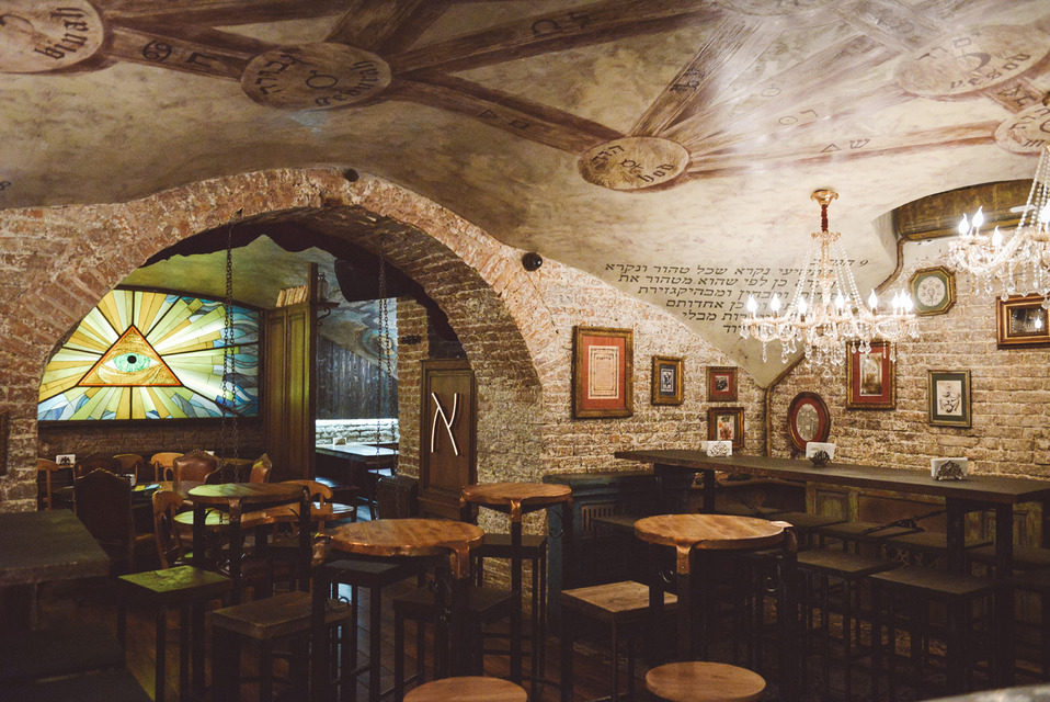 Эпатажный ресторан современной еврейской кухни. Заведение впечатляет уже с порога: сводчатые потолки с хрустальными люстрами в паутине, масонские символы и каббалистические знаки, глобусы и старинные книги создают мистическую и вместе с тем театральную атмосферу (оформлением действительно занимался театральный декоратор). В небольшом меню блюда разных направлений еврейской кухни соседствуют с авторскими позициями. По выходным в баре Мицва проходят вечеринки с диджей-сетами.