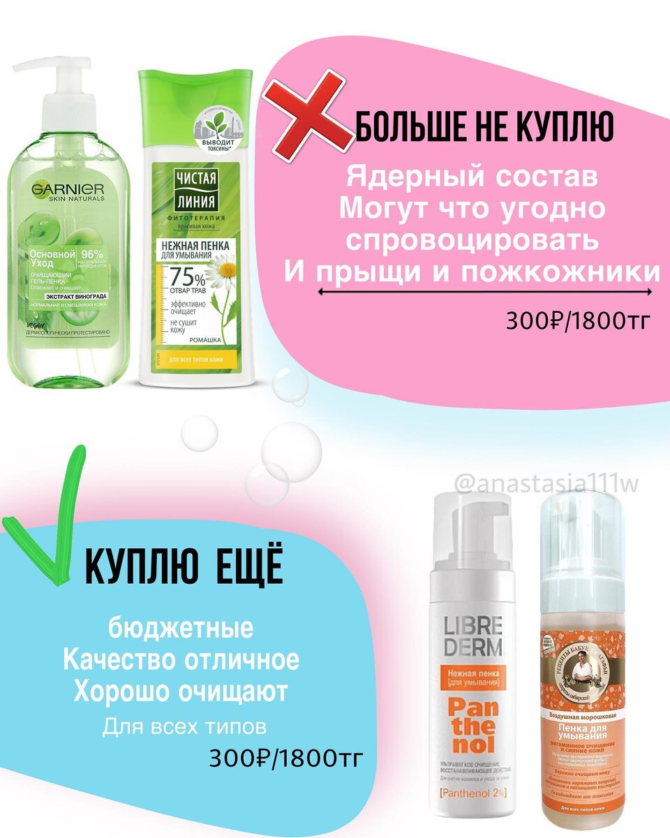 Многие знают, что именно пенка является важной составляющей при уходе за кожей лица и её обязательно нужно использовать при умывании. Предлагаю вам сегодня ознакомиться с пенками для умывания, какую можно брать, а какая будет пустой тратой денег или только навредит вам. И так поехали смотреть: Кстати многие пользуются этой пенкой от "Чистой линии" и "Гарниер". Если они у вас есть вы наверное не раз уже замечали проблемы с кожей? "Чёрный жемчуг" и "Дав" из той же серии. Пожалуй здесь без комментариев. Идём дальше И завершают нашу статью эти пенки для умывания. А вы нашли свои пенки в этом списке?