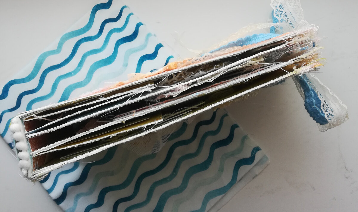 Я планировала прошить все страницы по контуру, но слишком много слоев декора этому помешали, а перед прошивкой я уже приклеила страницы, поэтому оставила так)
