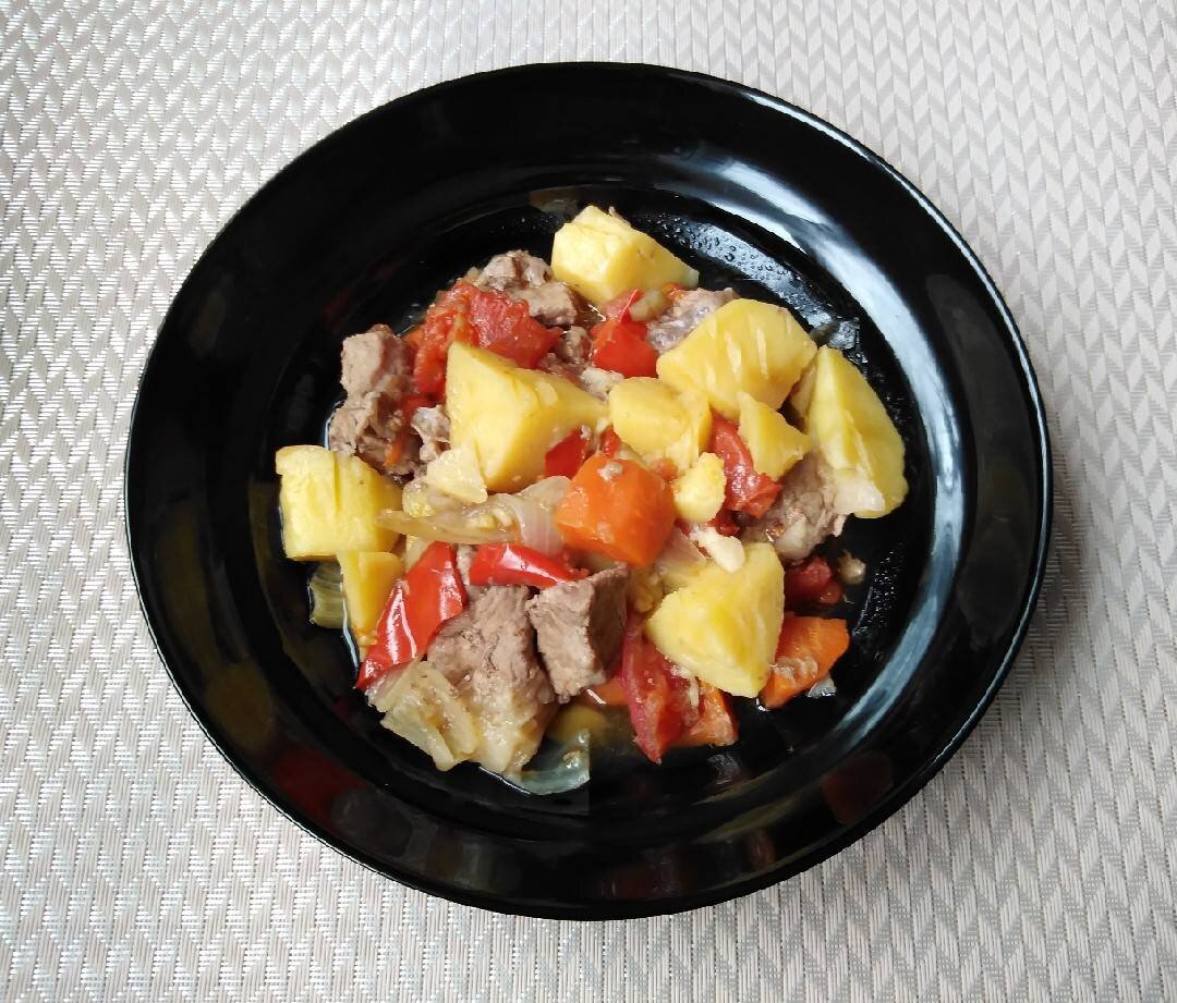 Ингредиенты: Говядина, у меня тонкий край, Курдючный жир по желанию, Или только баранина, Картофель, Морковь, Красный сладкий перец, Помидоры, Чеснок, Репчатый лук, Острый перец халапеньо по желанию, Соль