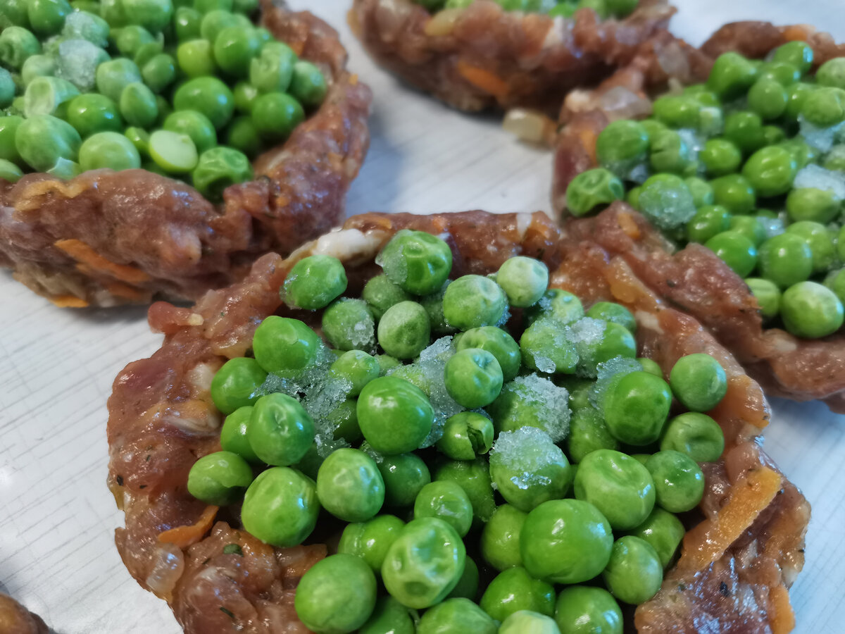 Ожидаемо, самым заметным полуфабрикатом на фото моей апрельской заготовки стали вот эти гнезда с зелёным горошком. В комментариях я уже отвечала, что готовятся они очень просто и по сути это фарш, в котором сформировано углубление и в него заложена начинка. В данном случае замороженный зелёный горошек, но варианты могут быть совершенно разными. Горошек, если что, я покупаю бренда Лента. Он вкусный и бывают акции, можно взять не так уж дорого, а рацион разнообразить зимой самое то. Такие гнезда я делала в заморозку и с шампиньонами, хотя подойдут любые грибы, просто шампиньоны самые доступные для меня, городского жителя, который грибы собирать вообще не умеет. Те кто умеет для меня какие-то супер люди )) Ещё в начинку таких гнезд из фарша можно отправить овощную смесь из всего, что лежит в морозилке с лета или растет на грядке, это уж смотря какой сезон на дворе. Помидор, перец сладкий, морковь, лук, горошек, да хоть кабачок! Можно зажарку из лука и моркови сделать и в гнезда "упак