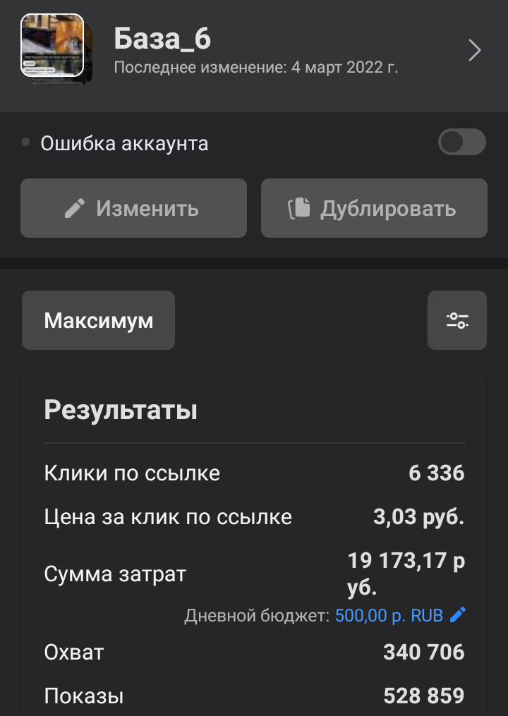 Результаты работы с 27 февраля 2022 по 1 марта 2022 Было сделано: 1. Проанализированы предыдущие рекламные кампании 2. Созданы 16 новых аудиторий, но протестированы только 3 Все по гео Москва. Лучше всего себя показала аудитория Путешествия. Дневной бюджет составлял 200 руб. Неработающие объявления были выключены и бюджет на группу Путешествия был увеличен до 400 руб. 3. Созданы несколько баннеров с оффером "До 31 марта аренда 7000 руб/сутки" Этот баннер показал себя лучше всего во всех аудиториях. 4. Реклама запущена с целью Трафик Результаты: