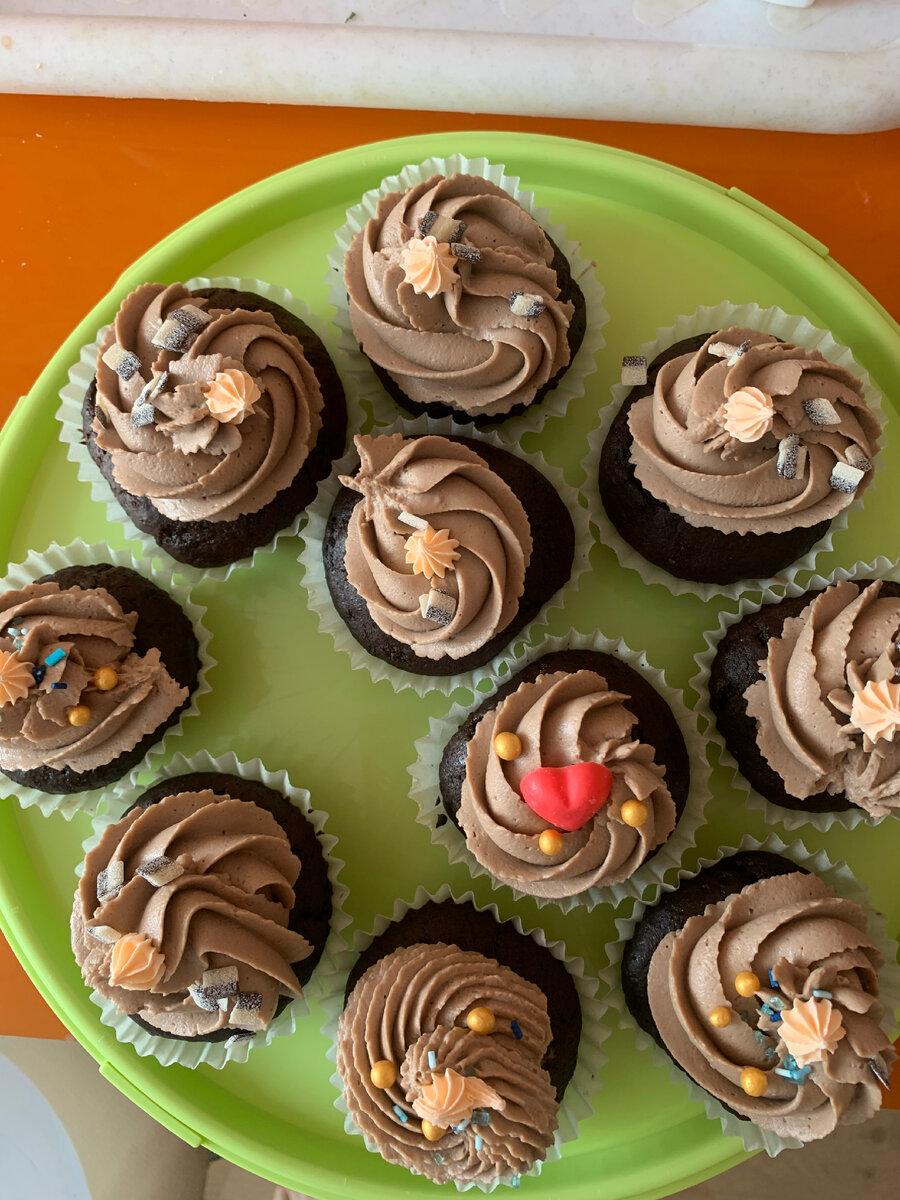 Тесто для капкейков: 1 чаша: 2 яйца+180гр.сахара+ванилин=все взбиваем до объема 2 чаша: 180мл.кефира+2/3ч.ложки соды+120мл.растительного масла(его вводишь тонкой струйкой интенсивно перемешивая) 3 чаша: 220гр.муки+2/3ч.ложки разрыхлителя+ какао(20-50гр.на усмотрения по цвету и вкусу)=все перемешать венчиком до однородного цвета. 1чаша+2чаша= все перемешать,+ 3чаша=до однородного состояния. Будет жидковато не страшно, заполняем форму на 2/3 объема, печь при180град. ориентировочно 20мин, проверяем готовность шпажкой. Мой секретик для сочности десерта: после того как капкейки остынут, я прокалываю верх капкейков палочкой для роллов (хаси) и силиконовой кисточкой смазываю молоком. Внутрь капкейков при помощи шприца заправляю топингом или джем+коньяк. Крем: 1 вариант 100 г сливочного масла размягченного 300 г творожного сливочного сыра 100 г сахарной пудры Все перемешиваем миксером или блендером, перекладываем в кондитерский мешок и красиво выкладываем крем. 2 вариант 150 г взбиты