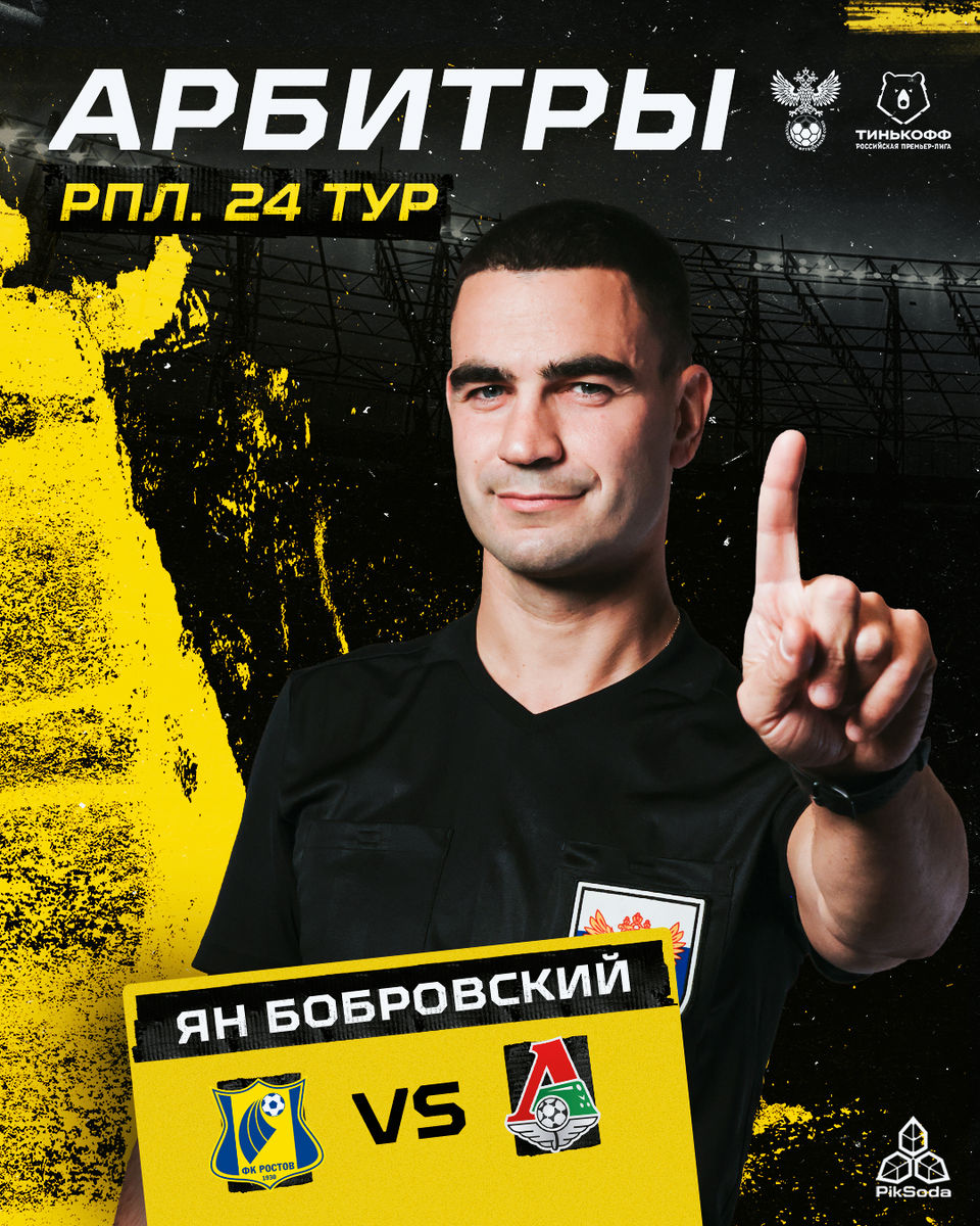 Назначены арбитры и инспекторы на матчи 24-го тура Тинькофф Российской Премьер-лиги. Встреча между «Ростовом» и «Локомотивом», которая состоится в воскресенье, 10 апреля, на стадионе «Ростов Арена» в Ростове-на-Дону, доверена бригаде Яна Бобровского. 9 апреля (суббота) «Нижний Новгород» – «Динамо»: судья – Виталий Мешков, ассистенты судьи – Алексей Лунёв, Александр Богданов; резервный судья – Игорь Низовцев; VAR – Сергей Иванов; AVAR – Алексей Воронцов; инспектор – Юрий Чеботарёв. «Химки» – ЦСКА: судья – Павел Кукуян, ассистенты судьи – Алексей Стипиди, Владимир Миневич; резервный судья – Антон Фролов; VAR – Иван Сиденков; AVAR – Максим Гаврилин; инспектор – Андрей Бутенко. «Рубин» – «Краснодар»: судья – Владимир Москалёв, ассистенты судьи – Дмитрий Чельцов, Андрей Болотенков; резервный судья – Евгений Буланов; VAR – Евгений Турбин; AVAR – Илья Елеференко; инспектор – Николай Левников. «Ахмат» – «Зенит»: судья – Алексей Матюнин, ассистенты судьи – Дмитрий Мосякин, Антон Кобзев; резервн