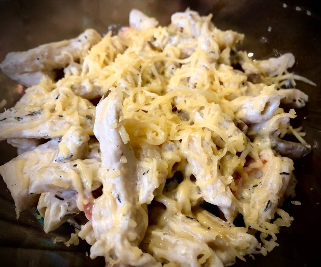 Ингредиенты: Паста, Морковь, Куриное филе, Шампиньоны, Сливки 20% , Сыр, Оливковое масло, Итальянские травы