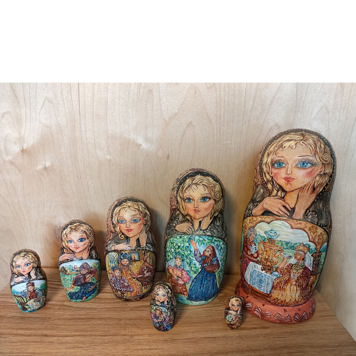 Россия останется Россией. Мы тут. Мы дома. Голова тоже на месте, значит, всё будет хорошо! Мы, русские, чтим наши традиции, любим символы, пришедшие к нам из дальней древности, а красавиц-матрешек можем рассматривать бесконечно) Кому может не нравиться эта забава?! раскрывая матрёшку - открываешь новый секрет, извлекаешь это чудо, рассматриваешь, наслаждаешься, вдохновляешься! а на следующем уровне тебе предстает найти новую идею, доходишь до самой маленькой и складываешь обратно, подбирая узор, как код к русской душе! По замыслу, сюжет иллюстраций отражает прекрасную, радостную жизнь русских деревенских красавиц. Много доброты, легкости, песен, красочных нарядов, витьеватых узоров, улыбок и ясных голубых глаз) Наслаждайтесь красотой, и пусть ваш день будет солнечным и мирным) это была большая, кропотливая работа, и я попрошу, поддержите меня, пожалуйста)