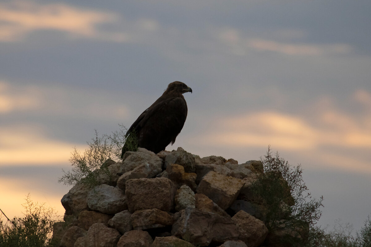 Во время путешествия в Калмыкию мы не раз встречали в степях заповедника "Черные земли" степного орла (Aquila nipalensis). В этих местах это все еще сравнительно обычный хищник. Иногда орлы сидели на кочках или грудах камней, как, например, этот, снятый в предрассветный час.