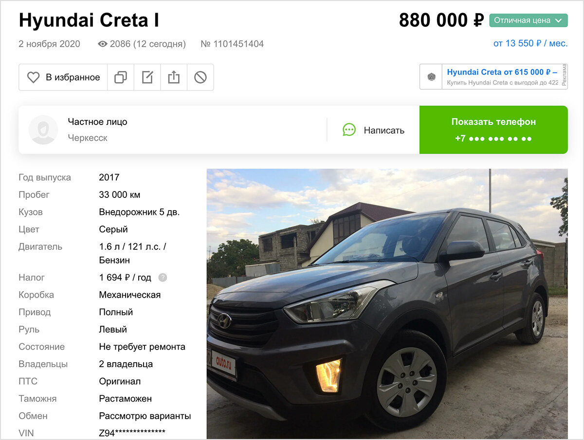 В рубрику «Не бит, не крашен» часто попадают автомобили премиум-сегмента, имеющих тёмное прошлое. И это легко объяснимо: чем выше цена, тем выше ставки. Но и в масс-маркете недобросовестные продавцы тоже есть — потому что бюджетные машины тоже становятся участниками аварий. Не выбрасывать же их после этого… Такие автомобили обычно выкупают, восстанавливают и потом продают — с пометкой «не битый, не крашеный». Только экономят на ремонте ещё больше, чем в «премиуме», чтобы все эти манипуляции имели смысл. Наша новая история — про Hyundai Creta 2017 года выпуска. Модель популярная, автомобиль свежий, в не самой мощной и дорогой, но довольно привлекательной версии — с полным приводом и механической коробкой передач. Пробег в 33 000 км вполне приемлемый для трёхлетней машины, как и цена 880 000 рублей. Это самая дешёвая Creta среди десятков себе подобных — того же возраста и комплектации. Причём продавец утверждает, что и состояние машины «отличное». Комментарий продавца «Машина в идеально