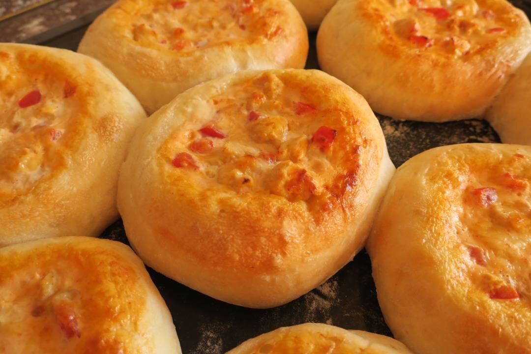 Разогреваем духовку до 200℃. Я буду печь в режиме с конвекцией «Пицца» (нижний нагрев + горячий воздух). Через 15-20 минут в центр каждой смаженки кладем начинку. Края смазываем любым «зарумянивателем». У меня кефир.