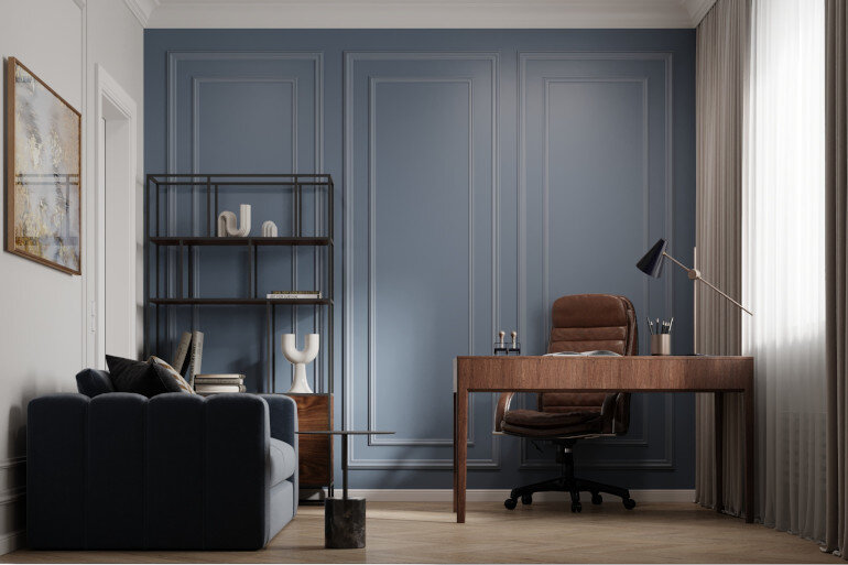 Перед нашей командой стояло несколько задач. Во-первых, кухню-гостиную необходимо было разделить на три территории: место готовки, ТВ-зона, а также большой обеденный стол для посиделок с друзьями и родственниками. Несмотря на то, что общественное пространство первого этажа небольшое, около 35 м2, нам удалось найти решение. За счет грамотного зонирования специалисты Brick to brick отделили кухню с барным островом от гостиной. В обоих помещениях мы задействовали светоотражающие поверхности, чтобы визуально расширить пространство. Так на стенах мы применили натуральный камень светлого оттенка. На кухне вы можете видеть матовые фасады с фрезеровкой, которые идеально вписываются в неоклассик