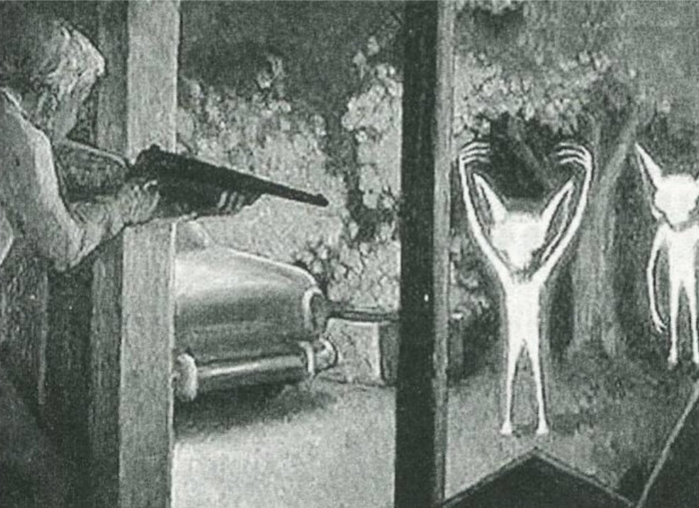 Когда оно двинулось навстречу, мужчины в панике бросились к дому и, остановившись только перед дверью, открыли огонь по неизвестному существу. Однако попавшие в него пули не нанесли повреждений, а лишь отбросили пришельца назад. Поднявшись, незваный гость бросился наутек.