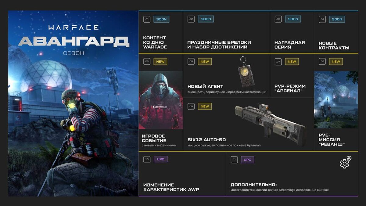 7 апреля 2022 года в бесплатном шутере Warface установлена новая часть обновления "Авангард". Разработчики подготовили крупное событие "Большая охота", набор агента Карп и контракты. Мероприятие "Большая охота" позволит получить специальную валюту за игру в PvE или PvP контент. Добавлена тематическая миссия "Реванш" с финальным боссом вертолетом. Ценители PvP составляющей могут играть в новый режим "Арсенал", являющийся аналогом легендарного GunGame из других онлайн шутеров. Предложено 3 контракта для получения ивентовой валюты. Участники смогут купить новинку SIX12 Auto-SD и множество других призов. Появилась внешность агента "Карп" для класса Медик, в состав входит экипировка, оружие, контракты и камуфляж. В очередной раз доработали технологию Texture Streaming, наконец-то добавили AWP и ввели много мелких исправлений. Новость на сайте: https://top-mmorpg.ru/novosti-i-video-onlayn-igr/4770-sobytie-bolshaya-ohota-i-agent-karp-v-warface-avangard.html